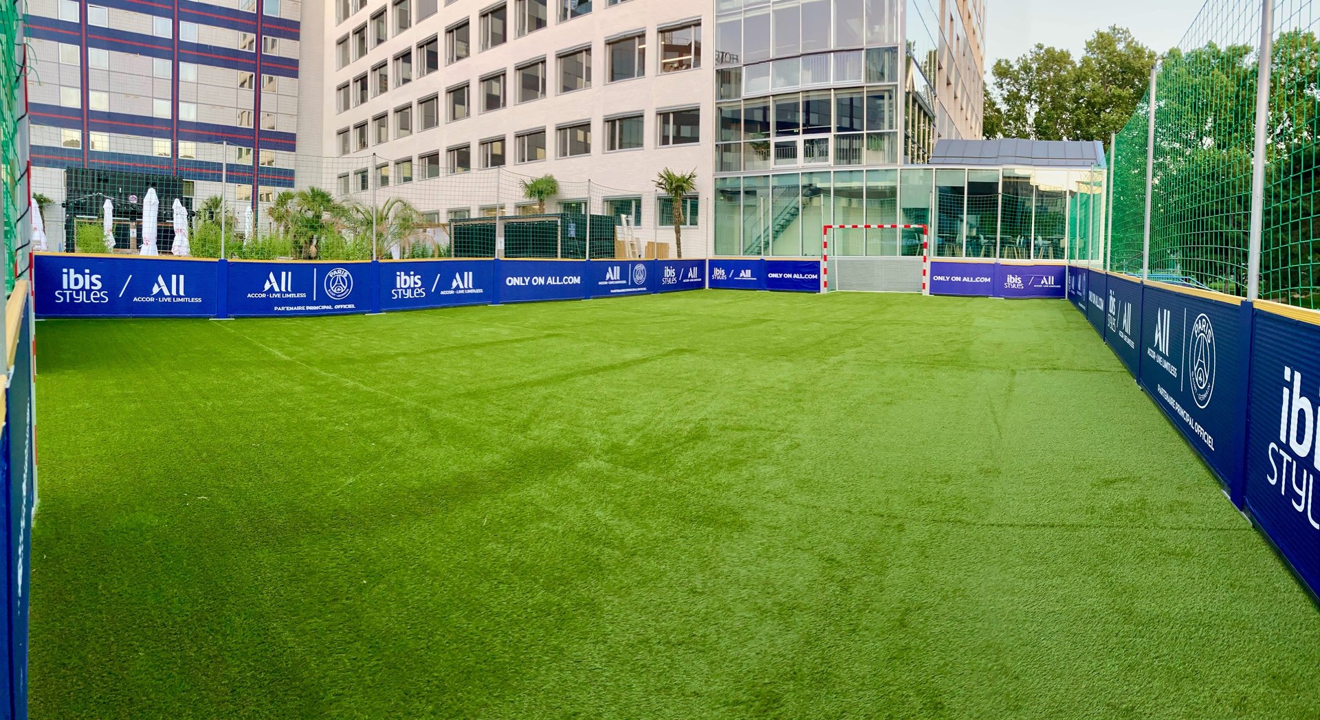 Nos terrains de football mobiles sont entièrement personnalisables selon vos besoins. Nous nous occupons de la pose des adhésifs sur les parois latérales et même de la création des visuels si vous le souhaitez !